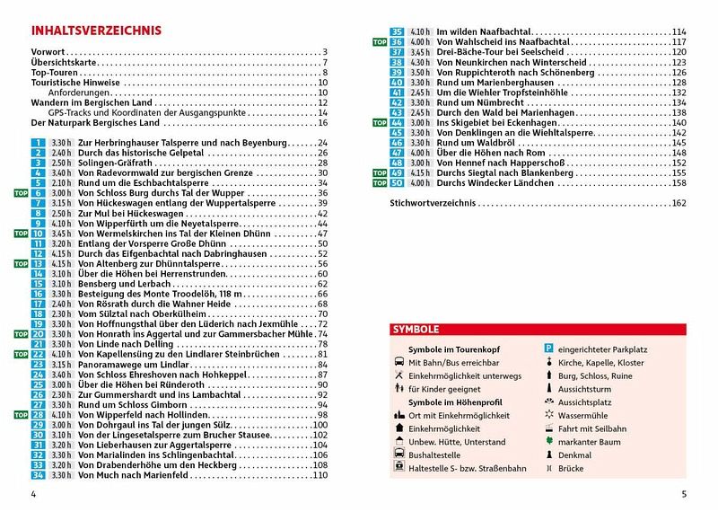 Das Wasser ist das bestimmende Element des Bergischen, unzählige Bäche und Flüsse haben seine Hügel und Täler geformt. Ein typisch bergischer Wanderweg verläuft in stetem Auf und Ab über aussichtsreiche Höhen, durch idyllische Bachtäler und hübsche Dörfer aus Fachwerk und Schiefer. Die Wege sind gut erschlossen, aber nicht überlaufen. Die frühe Industriekultur hat im ganzen Gebiet sehenswerte Spuren hinterlassen und bietet zusätzliche Attraktionen wie alte Steinbrüche, Wassermühlen und wassergetriebene Schmiedehämmer.
