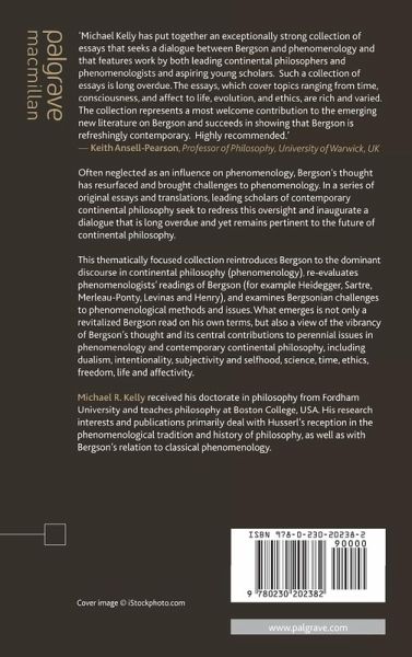 'Michael Kelly has put together an exceptionally strong collection of essays that seeks a dialogue between Bergson and phenomenology and that features work by both leading continental philosophers and phenomenologists and aspiring young scholars. Such a collection of essays is long overdue. The essays, which cover topics ranging from time, consciousness, and affect to life, evolution, and ethics, are rich and varied. The collection represents a most welcome contribution to the emerging new literature on Bergson and succeeds in showing that Bergson is refreshingly contemporary. Highly recommended. ' - Keith Ansell-Pearson, Professor of Philosophy, University of Warwick