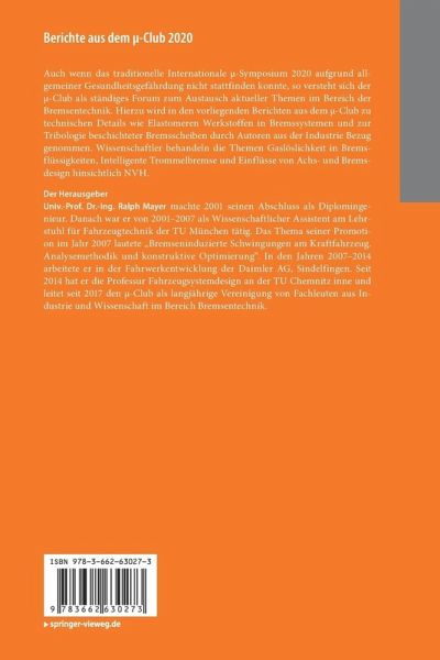 Auch wenn das traditionelle Internationale µ-Symposium 2020 aufgrund allgemeiner Gesundheitsgefährdung nicht stattfinden konnte, so versteht sich der µ-Club als ständiges Forum zum Austausch aktueller Themen im Bereich der Bremsentechnik. Hierzu wird in den vorliegenden Berichten aus dem µ-Club zu technischen Details wie Elastomeren Werkstoffen in Bremssystemen und zur Tribologie beschichteter Bremsscheiben durch Autoren aus der Industrie Bezug genommen. Wissenschaftler behandeln die Themen Gaslöslichkeit in Bremsflüssigkeiten, Intelligente Trommelbremse und Einflüsse von Achs- und Bremsdesign hinsichtlich NVH.