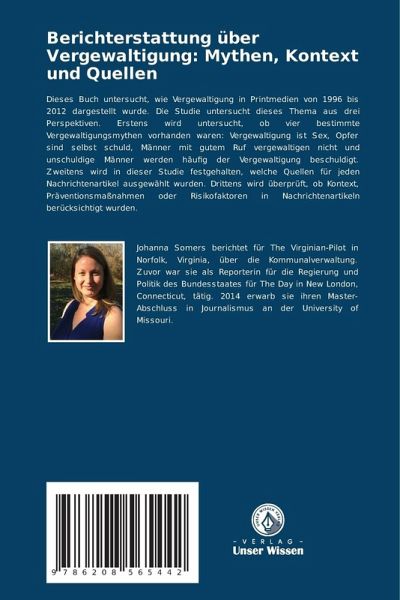 Dieses Buch untersucht, wie Vergewaltigung in Printmedien von 1996 bis 2012 dargestellt wurde. Die Studie untersucht dieses Thema aus drei Perspektiven. Erstens wird untersucht, ob vier bestimmte Vergewaltigungsmythen vorhanden waren: Vergewaltigung ist Sex, Opfer sind selbst schuld, Männer mit gutem Ruf vergewaltigen nicht und unschuldige Männer werden häufig der Vergewaltigung beschuldigt. Zweitens wird in dieser Studie festgehalten, welche Quellen für jeden Nachrichtenartikel ausgewählt wurden. Drittens wird überprüft, ob Kontext, Präventionsmaßnahmen oder Risikofaktoren in Nachrichtenartikeln berücksichtigt wurden.