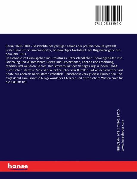 Berlin: 1688-1840 - Geschichte des geistigen Lebens der preußischen Hauptstadt. Erster Band ist ein unveränderter, hochwertiger Nachdruck der Originalausgabe aus dem Jahr 1893.