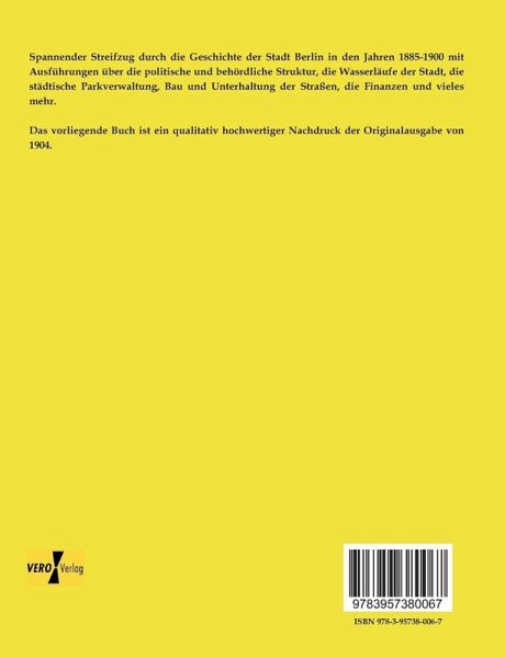 Spannender Streifzug durch die Geschichte der Stadt Berlin in den Jahren 1885-1900 mit Ausführungen über die politische und behördliche Struktur, die Wasserläufe der Stadt, die städtische Parkverwaltung, Bau und Unterhaltung der Straßen, die Finanzen und vieles mehr.