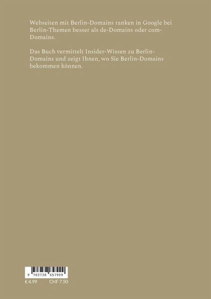 Webseiten mit Berlin-Domains ranken in Google bei Berlin-Themen besser als de-Domains oder com-Domains.Das Buch vermittelt Insider-Wissen zu Berlin-Domains und zeigt Ihnen, wo Sie Berlin-Domains bekommen können.