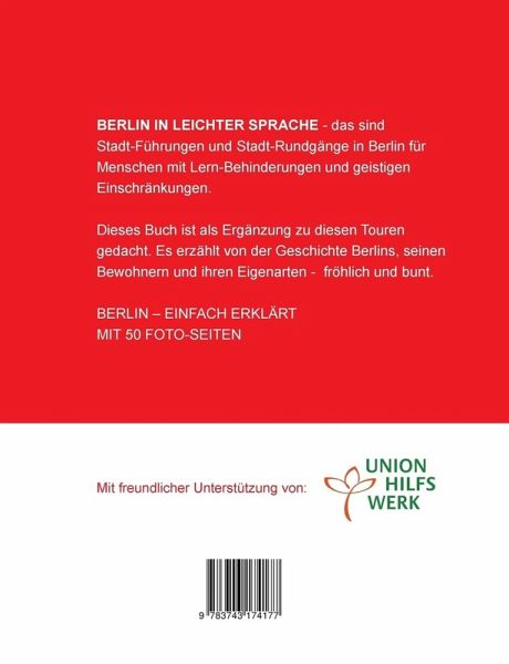 Berlin in leichter Sprache - das sind Stadt-Führungen und Stadt-Rundgänge für Menschen mit Lernbehinderungen und geistigen Einschränkungen in Berlin. Dieses Buch ist als Ergänzung zu diesen Touren gedacht. Es erzählt von der Geschichte Berlins, seinen Bewohnern und ihren Eigenarten - fröhlich und bunt. Viele Bilder und kurze Texte ermöglichen Menschen mit geistigen Behinderungen die Teilnahme am Tourismus dieser schönen Stadt.