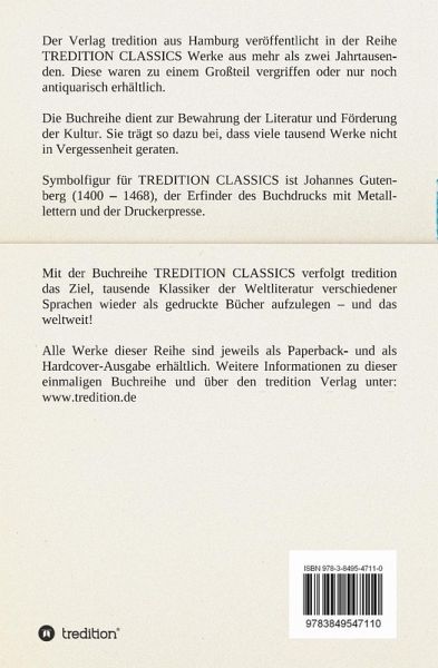 Dieses Werk ist Teil der Buchreihe TREDITION CLASSICS. Der Verlag tredition aus Hamburg veröffentlicht in der Buchreihe TREDITION CLASSICS Werke aus mehr als zwei Jahrtausenden. Diese waren zu einem Großteil vergriffen oder nur noch antiquarisch erhältlich. Mit der Buchreihe TREDITION CLASSICS verfolgt tredition das Ziel, tausende Klassiker der Weltliteratur verschiedener Sprachen wieder als gedruckte Bücher zu verlegen und das weltweit! Die Buchreihe dient zur Bewahrung der Literatur und Förderung der Kultur. Sie trägt so dazu bei, dass viele tausend Werke nicht in Vergessenheit geraten.