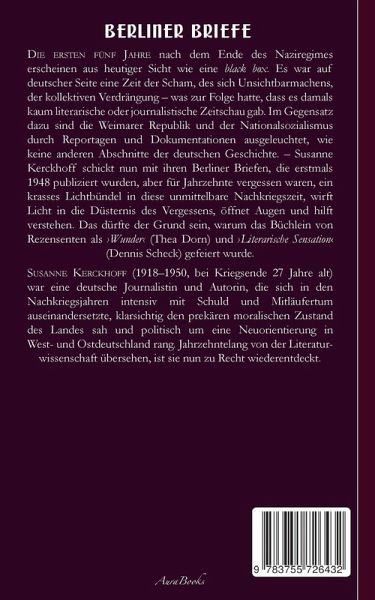 Susanne Kerckhoff: Berliner Briefe / Neu lektorierte 2021er Ausgabe, mit Fußnoten / Die ersten fünf Jahre nach dem Ende des Naziregimes erscheinen aus heutiger Sicht wie eine black box. Es war auf deutscher Seite eine Zeit der Scham, des sich Unsichtbarmachens, der kollektiven Verdrängung - was zur Folge hatte, dass es damals kaum literarische oder journalistische Zeitschau gab. Im Gegensatz dazu sind die Weimarer Republik und der Nationalsozialismus durch Reportagen und Dokumentationen ausgeleuchtet, wie keine anderen Abschnitte der deutschen Geschichte. - Susanne Kerckhoff schickt nun mit ihren Berliner Briefen, die erstmals 1948 publiziert wurden, aber für Jahrzehnte vergessen waren, ein krasses Lichtbündel in diese unmittelbare Nachkriegszeit, wirft Licht in die Düsternis des Vergessens, öffnet Augen und hilft verstehen. Das dürfte der Grund sein, warum das Büchlein von Rezensenten als »Wunder« (Thea Dorn) und »Literarische Sensation« (Dennis Scheck) gefeiert wurde.