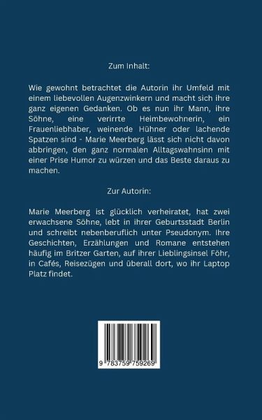 Wie gewohnt betrachtet die Autorin ihr Umfeld mit einem liebevollen Augenzwinkern und macht sich ihre ganz eigenen Gedanken. Ob es nun ihr Mann, ihre Söhne, eine verirrte Heimbewohnerin, ein Frauenliebhaber, weinende Hühner oder lachende Spatzen sind - Marie Meerberg lässt sich nicht davon abbringen, den ganz normalen Alltagswahnsinn mit einer Prise Humor zu würzen und das Beste daraus zu machen.