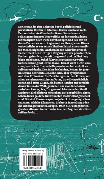 Der Roman ist eine Zeitreise durch politische und persönliche Welten in Istanbul, Berlin und New York. Der verheiratete Chemie-Professor Kemal versucht, sein eigenes inneres Verzweifeln an der empfundenen Sinnlosigkeit allen Tuns durch Drogen und Sex mit anderen Frauen zu verdrängen und zu überspielen. Dieses verheimlicht er vor seiner Ehefrau Zuhal, einer sensiblen Modedesignerin. Auch im hohen Alter hat er noch immer nicht den richtigen Umgang mit der persönlichen Freiheit gefunden, um mit ihr gesund und im Einklang leben zu können. Zuhal führt eine stumme Gewohnheitsbeziehung mit ihrem Mann. Kemal weiß nicht, dass sie episodisch auftretende Depressionen hat und oft an Selbstmord denkt. Der Sohn der beiden, Kenan, ist Journalist und Schriftsteller, sehr eitel, aber sympathisch und eine Frohnatur. Die Beziehung zu seinen Eltern, vor allem zu seinem exaltierten Vater, ist widersprüchlich. Kenan und seine Clique, ein bunter Haufen aus verschiedenen Teilen der Welt, genießen das mondäne Leben zwischen Partys, Sex, Drogen und hämmernder Musik. Moderne, globalisierte Menschen, gut ausgebildet, deren Leben durch goldene Kreditkarten materiell abgesichert sind. Sie sind Konsumexperten jeder Art: angesagte Restaurants, schicke Klamotten, die beste Sexstellung oder die wirkungsstärksten Drogen. Doch die Protagonisten geraten allesamt immer mehr in einen Sog, der sie mitzureißen droht.