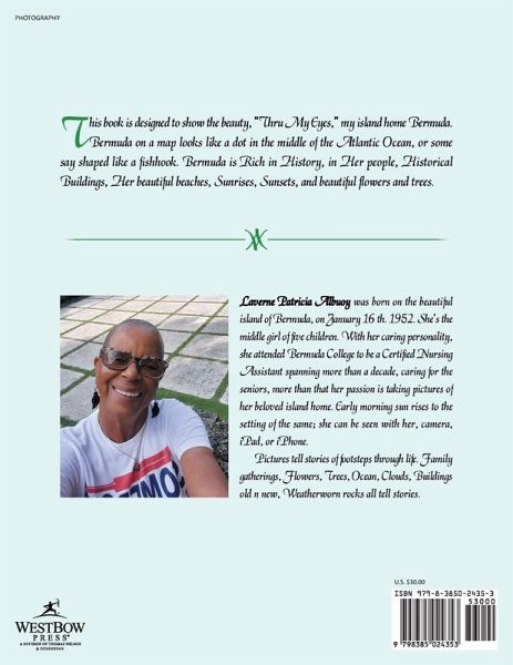 This book is designed to show the beauty, "Thru My Eyes," my island home Bermuda. Bermuda on a map looks like a dot in the middle of the Atlantic Ocean, or some say shaped like a fishhook. Bermuda is Rich in History, in Her people, Historical Buildings, Her beautiful beaches, Sunrises, Sunsets, and beautiful flowers and trees.