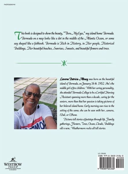This book is designed to show the beauty, "Thru My Eyes," my island home Bermuda. Bermuda on a map looks like a dot in the middle of the Atlantic Ocean, or some say shaped like a fishhook. Bermuda is Rich in History, in Her people, Historical Buildings, Her beautiful beaches, Sunrises, Sunsets, and beautiful flowers and trees.