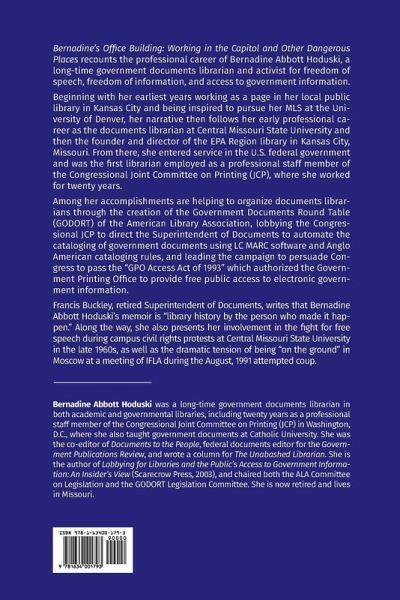 Bernadine's Office Building: Working in the Capitol and Other Dangerous Places recounts the professional career of Bernadine Abbott Hoduski, a long-time government documents librarian and activist for freedom of speech, freedom of information, and access to government information. Beginning with her earliest years working as a page in her local public library in Kansas City and being inspired to pursue her MLS at the University of Denver, her narrative then follows her early professional career as the documents librarian at Central Missouri State University and then the founder and director of the EPA Region library in Kansas City, Missouri. From there, she entered service in the U.S. federal government and was the first librarian employed as a professional staff member of the Congressional Joint Committee on Printing (JCP), where she worked for twenty years. Among her accomplishments are helping to organize documents librarians through the creation of the Government Documents Round Table (GODORT) of the American Library Association, lobbying the Congressional JCP to direct the Superintendent of Documents to automate the cataloging of government documents using LC MARC software and Anglo American cataloging rules, and leading the campaign to persuade Congress to pass the "GPO Access Act of 1993¿ which authorized the Government Printing Office to provide free public access to electronic government information. Francis Buckley, retired Superintendent of Documents, writes that Bernadine Abbott Hoduski's memoir is "library history by the person who made it happen." Along the way, she also presents her involvement in the fight for free speech during campus civil rights protests at Central Missouri State University in the late 1960s, as well as the dramatic tension of being "on the ground" in Moscow at a meeting of IFLA during the August, 1991 attempted coup. Bernadine Abbott Hoduski was a long-time government documents librarian in both academic and governmental libraries, including twenty years as a professional staff member of the Congressional Joint Committee on Printing (JCP) in Washington, D.C., where she also taught government documents at Catholic University. She was the co-editor of Documents to the People, federal documents editor for the Government Publications Review, and wrote a column for The Unabashed Librarian. She is the author of Lobbying for Libraries and the Public's Access to Government Information: An Insider's View (Scarecrow Press, 2003), and chaired both the ALA Committee on Legislation and the GODORT Legislation Committee. She is now retired and lives in Missouri.