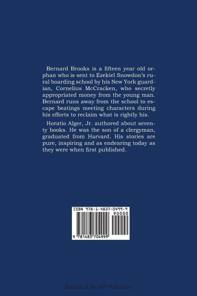 Bernard Brooks is a fifteen year old orphan who is sent to Ezekiel Snowdon's rural boarding school by his New York guardian, Cornelius McCracken, who secretly appropriated money from the young man. Bernard runs away from the school to escape beatings meeting characters during his efforts to reclaim what is rightly his. Horatio Alger, Jr. authored about seventy books. He was the son of a clergyman, graduated from Harvard. His stories are pure, inspiring and as endearing today as they were when first published.