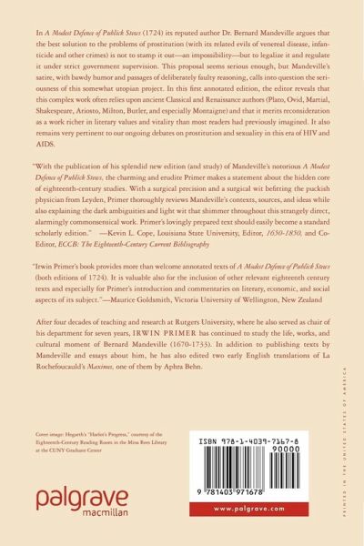 "Irwin Primer's book provides more than welcome annotated texts of A Modest Defence of Publick Stews (both editions of 1724). It is valuable also for the inclusion of other relevant Eighteenth Century texts and especially for Primer's introduction and commentaries on literary, economic, and social aspects of its subject." - MauriceGoldsmith, Victoria University of Wellington, New Zealand