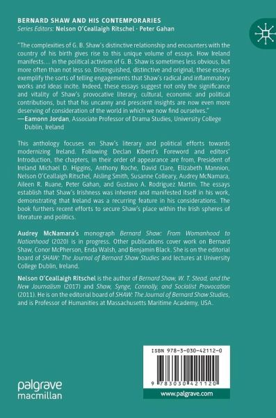 This book is an anthology focused on Shaw's efforts, literary and political, that worked toward a modernizing Ireland. Following Declan Kiberd's Foreword and the editor's Introduction, the contributing chapters, in their order of appearance, are from President of Ireland Michael D. Higgins, Anthony Roche, David Clare, Elizabeth Mannion, Nelson O'Ceallaigh Ritschel, Aisling Smith, Susanne Colleary, Audrey McNamara, Aileen R. Ruane, Peter Gahan, and Gustavo A. Rodriguez Martin. The essays establish that Shaw's Irishness was inherent and manifested itself in his work, demonstrating that Ireland was a recurring feature in his considerations. Locating Shaw within the march towards modernizing Ireland furthers the recent efforts to secure Shaw's place within the Irish spheres of literature and politics.