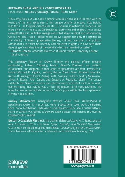 This book is an anthology focused on Shaw's efforts, literary and political, that worked toward a modernizing Ireland. Following Declan Kiberd's Foreword and the editor's Introduction, the contributing chapters, in their order of appearance, are from President of Ireland Michael D. Higgins, Anthony Roche, David Clare, Elizabeth Mannion, Nelson O'Ceallaigh Ritschel, Aisling Smith, Susanne Colleary, Audrey McNamara, Aileen R. Ruane, Peter Gahan, and Gustavo A. Rodriguez Martin. The essays establish that Shaw's Irishness was inherent and manifested itself in his work, demonstrating that Ireland was a recurring feature in his considerations. Locating Shaw within the march towards modernizing Ireland furthers the recent efforts to secure Shaw's place within the Irish spheres of literature and politics.