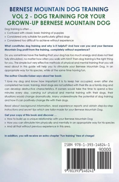 Bernese Mountain Dog Training Vol 2 - Dog Training for your grown-up Bernese Mountain Dog How to build up a unique relationship with your Bernese Mountain Dog, using training methods which are tailor-made for your Bernese Mountain Dog Dog training is often ...... Confused with classic basic training of puppies ... Considered only suitable for particularly gifted dogs ... Considered too difficult to achieve without experience What constitutes dog training and why is it helpful? And how can you and your Bernese Mountain Dog profit from the training, completely without experience? Do you sometimes have the feeling that your dog has too much energy and does not feel fully stimulated, no matter how often you walk with him? Then dog training is the right thing for you. The simple but very effective methods of physical and mental training that you will read about in this guide will help you to stimulate your Bernese Mountain Dog, in an appropriate way for his species, while at the same time having fun. This is volume two of the Bernese Mountain Dog training guides. Volume 1 for your Bernese Mountain puppy is also available with the title "Bernese Mountain Dog Training: Dog Training for your Bernese Mountain puppy". The author Claudia Kaiser says about her book: "I love my dog and know how important it is to keep her occupied, even after she completed her basic training. Most dogs are not satisfied with their life as a family dog and can develop destructive characteristics. If owners would take the time to spend a few minutes every day, carrying out physical and mental training with their dogs, their situations would change dramatically. Many underestimate the potential of dog training and how it can positively change life with their dogs." Read about background information, read experience reports and obtain step-by-step instructions and secret tips which are tailor-made for your Bernese Mountain Dog. Get your copy of this book and discover...... How to build up a unique relationship with your Bernese Mountain Dog ... How you can stimulate him physically and mentally in an appropriate way for his species ... And all that without previous experience in this area.