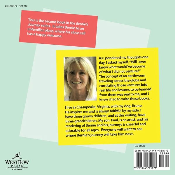 As I pondered my thoughts one day, I asked myself, "Will I ever know what would've become of what I did not venture?" The concept of an earthworm traveling across the globe and correlating those ventures into real life and lessons to be learned from them was real to me, and I knew I had to write these books. I live in Chesapeake, Virginia, with my dog, Bruno. He inspires me and is always faithful by my side. I have three grown children, and at this writing, have three grandchildren. My son, Paul, is an artist, and his rendering of Bernie and his journeys is cheerful and adorable for all ages. Everyone will want to see where Bernie's journey will take him next.