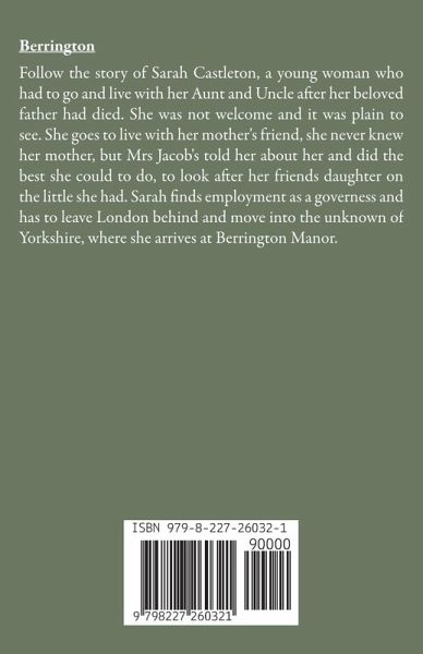 Berrington Follow the story of Sarah Castleton, a young woman who had to go and live with her Aunt and Uncle after her beloved father had died. She was not welcome and it was plain to see. She goes to live with her mother's friend, she never knew her mother, but Mrs Jacob's told her about her and did the best she could to do, to look after her friends daughter on the little she had. Sarah finds employment as a governess and has to leave London behind and move into the unknown of Yorkshire, where she arrives at Berrington Manor.
