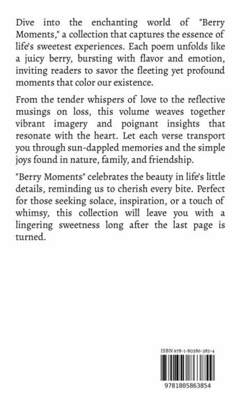 Dive into the enchanting world of "Berry Moments," a collection that captures the essence of life's sweetest experiences. Each poem unfolds like a juicy berry, bursting with flavor and emotion, inviting readers to savor the fleeting yet profound moments that color our existence. From the tender whispers of love to the reflective musings on loss, this volume weaves together vibrant imagery and poignant insights that resonate with the heart. Let each verse transport you through sun-dappled memories and the simple joys found in nature, family, and friendship. "Berry Moments" celebrates the beauty in life's little details, reminding us to cherish every bite. Perfect for those seeking solace, inspiration, or a touch of whimsy, this collection will leave you with a lingering sweetness long after the last page is turned.