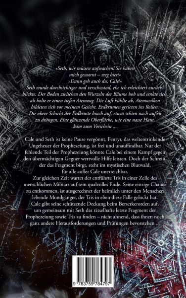 'Seth, wir müssen aufwachen! Sie haben mich gewarnt - weg hier!' 'Dann geh auch du, Cale!' Seth wurde durchsichtiger und verschwand, ehe ich erleichtert zurückblickte. Der Boden zwischen den Wurzeln der Bäume hob und senkte sich, als holte er einen tiefen Atemzug. Die Luft kühlte ab, Atemwolken bildeten sich vor meinem Gesicht. Erdkrumen gerieten ins Rollen. Die obere Schicht der Erdkruste brach auf, etwas schien nach außen zu drängen. Eine glänzende Oberfläche, wie eine nasse Haut, kam zum Vorschein ... Cale und Seth ist keine Pause vergönnt. Fenryr, das weltentrinkende Ungeheuer der Prophezeiung, ist frei und unauffindbar. Nur der fehlende Teil der Prophezeiung könnte Cale bei einem Kampf gegen den übermächtigen Gegner wertvolle Hilfe leisten. Doch der Schrein, der das Fragment birgt, steht im mystischen Blutwald, für alle außer Cale unerreichbar. Zur gleichen Zeit wartet der entführte Tris in einer Zelle des menschlichen Militärs auf sein qualvolles Ende. Seine einzige Chance zu entkommen, ist ausgerechnet der heimlich unter den Menschen lebende Mondgänger, der Tris in eben diese Falle gelockt hat. Cale gibt seine schützende Deckung beim Berserkerorden auf, um gemeinsam mit Seth das rätselhafte letzte Fragment der Prophezeiung sowie Tris zu finden - nicht ahnend, dass ihnen noch ganz andere Herausforderungen und Prüfungen bevorstehen...