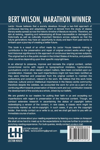 NEW PRINT WITH PROFESSIONAL TYPE-SET IN CONTRAST TO SCANNED PRINTS OFFERED BY OTHERS Bert Wilson, Marathon Winner This book is a result of an effort made by us towards making a contribution to the preservation and repair of original classic literature. In an attempt to preserve, improve and recreate the original content, we have worked towards: 1. Type-setting & Reformatting: The complete work has been re-designed via professional layout, formatting and type-setting tools to re-create the same edition with rich typography, graphics, high quality images, and table elements, giving our readers the feel of holding a 'fresh and newly' reprinted and/or revised edition, as opposed to other scanned & printed (Optical Character Recognition - OCR) reproductions. 2. Correction of imperfections: As the work was re-created from the scratch, therefore, it was vetted to rectify certain conventional norms with regard to typographical mistakes, hyphenations, punctuations, blurred images, missing content/pages, and/or other related subject matters, upon our consideration. Every attempt was made to rectify the imperfections related to omitted constructs in the original edition via other references. However, a few of such imperfections which could not be rectified due to intentional\unintentional omission of content in the original edition, were inherited and preserved from the original work to maintain the authenticity and construct, relevant to the work. We believe that this work holds historical, cultural and/or intellectual importance in the literary works community, therefore despite the oddities, we accounted the work for print as a part of our continuing effort towards preservation of literary work and our contribution towards the development of the society as a whole, driven by our beliefs. We are grateful to our readers for putting their faith in us and accepting our imperfections with regard to preservation of the historical content. HAPPY READING!