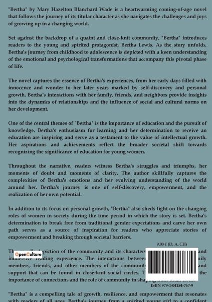 "Bertha" by Mary Hazelton Blanchard Wade is a heartwarming coming-of-age novel that follows the journey of its titular character as she navigates the challenges and joys of growing up in a changing world. Set against the backdrop of a quaint and close-knit community, "Bertha" introduces readers to the young and spirited protagonist, Bertha Lewis. As the story unfolds, Bertha's journey from childhood to adolescence is depicted with a keen understanding of the emotional and psychological transformations that accompany this pivotal phase of life. The novel captures the essence of Bertha's experiences, from her early days filled with innocence and wonder to her later years marked by self-discovery and personal growth. Bertha's interactions with her family, friends, and neighbors provide insights into the dynamics of relationships and the influence of social and cultural norms on her development. One of the central themes of "Bertha" is the importance of education and the pursuit of knowledge. Bertha's enthusiasm for learning and her determination to receive an education are inspiring and serve as a testament to the value of intellectual growth. Her aspirations and achievements reflect the broader societal shift towards recognizing the significance of education for young women. Throughout the narrative, readers witness Bertha's struggles and triumphs, her moments of doubt and moments of clarity. The author skillfully captures the complexities of Bertha's emotions and her evolving understanding of the world around her. Bertha's journey is one of self-discovery, empowerment, and the realization of her own potential. In addition to its focus on personal growth, "Bertha" also sheds light on the changing roles of women in society during the time period in which the story is set. Bertha's determination to break free from traditional gender expectations and carve her own path serves as a source of inspiration for readers who appreciate stories of empowerment and breaking through societal barriers. The novel's depiction of the community and its characters contributes to a rich and immersive reading experience. The interactions between Bertha and her family members, friends, and other members of the community reflect the warmth and support that can be found in close-knit social circles. The novel underscores the importance of connections and the role of community in shaping individual lives. "Bertha" is a compelling tale of growth, resilience, and empowerment that resonates with readers of all ages. Bertha's journey from a spirited young girl to a confident young woman is a testament to the power of determination, the pursuit of education, and the ability to overcome obstacles. Through Bertha's experiences, readers are invited to reflect on their own journeys of self-discovery and the transformative power of embracing change.