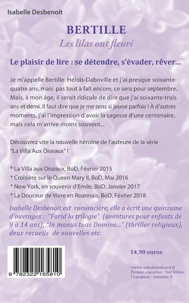 Je m'appelle Bertille Hélois-Daboville et j'ai presque soixante-quatre ans, mais pas tout à fait encore, ce sera pour septembre ! Mais, à mon âge, il serait ridicule de dire que j'ai soixante-trois ans et demi ! Quoique .. Il faut dire que je me sens si jeune parfois ! À d'autres moments, j'ai l'impression d'avoir la sagesse d'une centenaire mais enfin, cela m'arrive moins souvent.Découvrez vite la nouvelle héroïne de l'auteure de la série "La Villa aux Oiseaux" !