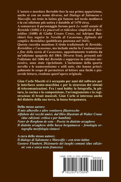 L'astuto e mordace Bertoldo fece la sua prima apparizione, anche se con un nome diverso, nel "Dialogo di Salomone e Marcolfo", un testo in latino la cui edizione più antica è databile al 1470 circa. A consacrare il personaggio furono però "Le sottili astutie di Bertoldo" (1606) e "Le piacevoli et ridicolose simplicità di Bertoldino" (1608) di Giulio Cesare Croce, cui Adriano Banchieri fece seguire la "Novella di Cacasenno, figliuolo del semplice Bertoldino" (pubblicata postuma nel 1641). Questa raccolta mantiene il titolo tradizionale di "Bertoldo, Bertoldino e Cacasenno", ma include anche la "Continuazione e fine della storia di Cacasenno", appositamente tradotta da un'edizione spagnola del 1864. Diverse frasi, presenti nell'edizione del 1606 del Bertoldo e soppresse in edizioni successive, sono state ripristinate. L'inclusione della quarta novella e le numerosissime e utili note, che hanno principalmente lo scopo di permettere al lettore una facile e piacevole lettura, rendono quest'opera originale.