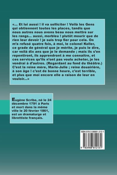 ... Et lui aussi ! il va solliciter ! Voilà les Gens qui obtiennent toutes les places, tandis que nous autres nous avons beau nous mettre sur les rangs... aussi, morbleu ! plutôt mourir que de rien leur devoir ! je suis trop fier pour cela. On m'a refusé quatre fois, à moi, le colonel Koller, ce grade de général que je mérite, je puis le dire, car voilà dix ans que je le demande ; mais ils s'en repentiront, ils apprendront à me connaître, et ces services qu'ils n'ont pas voulu acheter, je les vendrai à d'autres. (Regardant au fond du théâtre.) C'est la reine mère, Marie-Julie ; reine douairière, à son âge ! c'est de bonne heure, c'est terrible, et plus que moi encore elle a raison de leur en vouloir...