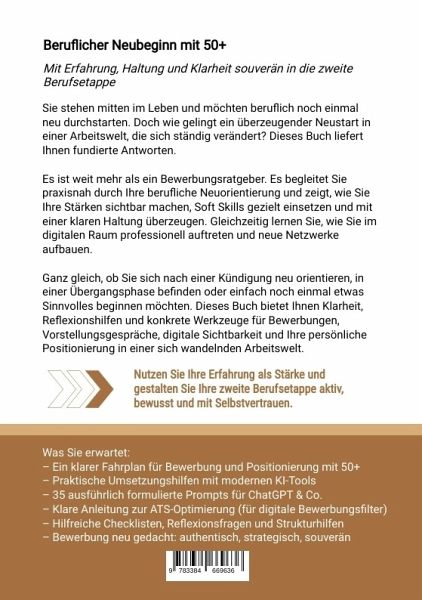 Dieses Buch begleitet Menschen ab 50 auf dem Weg zu einer erfolgreichen beruflichen Neuorientierung. Es zeigt, wie man mit Erfahrung, Haltung und Klarheit überzeugt - im Lebenslauf, im Vorstellungsgespräch und im digitalen Auftritt. Statt allgemeiner Bewerbungstipps bietet es praxisnahe Impulse, Reflexionshilfen und Strategien für eine selbstbewusste Positionierung im modernen Arbeitsmarkt. Wer nicht nur einen neuen Job, sondern eine neue berufliche Perspektive sucht, findet hier Orientierung, Ermutigung und konkrete Werkzeuge.Was Sie erwartet:- Ein klarer Fahrplan für Bewerbung und Positionierung mit 50+- Praktische Umsetzungshilfen mit modernen KI-Tools- 35 ausführlich formulierte Prompts für ChatGPT & Co.- Klare Anleitung zur ATS-Optimierung- Hilfreiche Checklisten, Reflexionsfragen und Strukturhilfen- Bewerbung neu gedacht: authentisch, strategisch, souverän