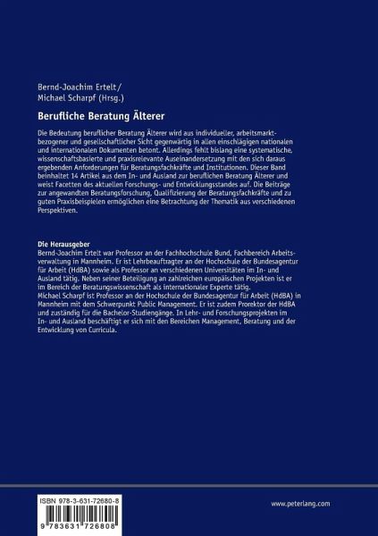 Bernd-Joachim Ertelt war Professor an der Fachhochschule Bund, Fachbereich Arbeitsverwaltung in Mannheim. Er ist Lehrbeauftragter an der Hochschule der Bundesagentur für Arbeit (HdBA) sowie als Professor an verschiedenen Universitäten im In- und Ausland tätig. Neben seiner Beteiligung an zahlreichen europäischen Projekten ist er im Bereich der Beratungswissenschaft als internationaler Experte tätig. Michael Scharpf ist Professor an der Hochschule der Bundesagentur für Arbeit (HdBA) in Mannheim mit dem Schwerpunkt Public Management. Er ist zudem Prorektor der HdBA und zuständig für die Bachelor-Studiengänge. In Lehr- und Forschungsprojekten im In- und Ausland beschäftigt er sich mit den Bereichen Management, Beratung und der Entwicklung von Curricula.