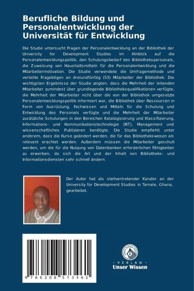 Die Studie untersucht Fragen der Personalentwicklung an der Bibliothek der University for Development Studies im Hinblick auf die Personalentwicklungspolitik, den Schulungsbedarf des Bibliothekspersonals, die Zuweisung von Haushaltsmitteln für die Personalentwicklung und die Mitarbeitermotivation. Die Studie verwendete die Umfragemethode und verteilte Fragebögen an dreiundfünfzig (53) Mitarbeiter der Bibliothek. Die wichtigsten Ergebnisse der Studie zeigten, dass die Mehrheit der leitenden Mitarbeiter zumindest über grundlegende Bibliotheksqualifikationen verfügte, die Mehrheit der Mitarbeiter nicht über die von der Bibliothek umgesetzte Personalentwicklungspolitik informiert war, die Bibliothek über Ressourcen in Form von Ausrüstung, Fachwissen und Mitteln für die Schulung und Entwicklung des Personals verfügte und die Mehrheit der Mitarbeiter zusätzliche Schulungen in den Bereichen Katalogisierung und Klassifizierung, Informations- und Kommunikationstechnologie (IKT), Management und wissenschaftliches Publizieren benötigte. Die Studie empfiehlt unter anderem, dass die Kurse geändert werden, die für das Bibliothekswesen als relevant erachtet werden. Außerdem müssen die Mitarbeiter geschult werden, um die für die Nutzung von Datenbanken erforderlichen Fähigkeiten zu erwerben, da sich die Art und der Inhalt von Bibliotheks- und Informationsdiensten sehr schnell ändern.