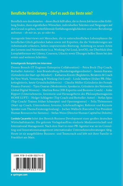 Anregende Interviews mit Menschen, die in unterschiedlichen Lebensphasen ihr berufliches Glück gefunden haben sowie mit Experten, die die Veränderungen am Arbeitsmarkt erläutern, liefern inspirierendes Rüstzeug. Anleitung zu neuen Arten des Lernens und Netzwerkens (u.a. Working Out Loud, lernOS), ein Überblick über Lernplattformen wie Udemy, Coursera, Udacity sowie Übungen helfen Ihnen bei den ersten und weiteren Schritten.