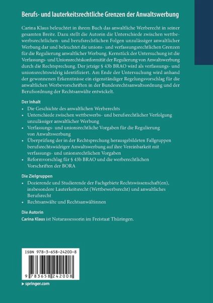 43b BRAO wird als verfassungs- und unionsrechtswidrig identifiziert. Am Ende der Untersuchung wird anhand der gewonnenen Erkenntnisse ein eigenständiger Regelungsvorschlag für die anwaltlichen Werbevorschriften in der Bundesrechtsanwaltsordnung und der Berufsordnung der Rechtsanwälte entwickelt.