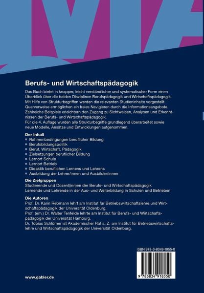 Das Buch bietet in knapper, leicht verständlicher und systematischer Form einen Überblick über die beiden Disziplinen Berufspädagogik und Wirtschaftspädagogik. Mit Hilfe von Strukturbegriffen werden die relevanten Studieninhalte vorgestellt. Querverweise ermöglichen ein freies Navigieren durch die Informationsangebote. Zahlreiche Beispiele erleichtern den Zugang zu Sichtweisen, Analysen und Erkenntnissen der Berufs- und Wirtschaftspädagogik.