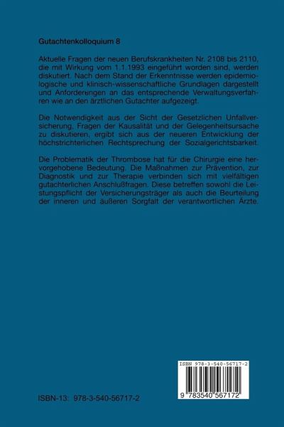 I Berufsbedingte Wirbelsäulenschäden.- Erfahrungen mit der BK "Verschleißkrankheiten der Wirbelsäule (Bandscheiben, Wirbelkörperabschlußplatten, Wirbelfortsätze, Bänder, kleine Wirbelgelenke) durch langjährige mechanische Überbelastung - BK 70 -" in der ehemaligen DDR.- Zur Frage berufsbedingter Erkrankungen der Halswirbelsäule aus arbeitsmedizinischer Sicht.- Zur Frage berufsbedingter Erkrankungen der Halswirbelsäule aus gutachtlicher Sicht.- Zur Frage berufsbedingter Erkrankungen der Lendenwirbelsäule aus biomechanischer Sicht.- Zur Frage berufsbedingter Erkrankungen der Lendenwirbelsäule aus arbeitsmedizinischer Sicht.- Zur Frage berufsbedingter Erkrankungen der Lendenwirbelsäule aus gutachtlicher Sicht.- Zur Frage berufsbedingter Erkrankungen der Wirbelsäule durch Ganzkörperschwingungen aus arbeitsmedizinischer Sicht.- Zur Frage berufsbedingter Erkrankungen der Lendenwirbelsäule durch Ganzkörperschwingungen aus gutachtlicher Sicht.- Fragen aus der Verwaltung zur neuen BK "Wirbelsäulenschäden".- Diskussion.- Anhang A-C: Merkblätter für die ärztliche Untersuchung zu BK 2108-2110.- II Unfallbegriff und Kausalität in der Gesetzlichen Unfallversicherung.- Unfallbegriff und Kausalität in der Gesetzlichen Unfallversicherung.- Gelegenheitsursache - versicherungsrechtliche Definition als Hilfe für den Gutachter?.- Zum Beweis der Schadensanlage aus juristischer Sicht.- Zum Beweis der Schadensanlage aus gutachtlicher Sicht.- Wesentliche Teilursächlichkeit - dargestellt anhand konkreter Beispiele aus der Praxis des Verwaltungsjuristen.- Wesentliche Teilursächlichkeit - dargestellt anhand konkreter Beispiele aus der Praxis des Unfallchirurgen.- Wesentliche Teilursächlichkeit aus der Praxis des Unfallchirurgen.- Diskussion.- IIIDie Thrombose.- Entstehung, Diagnostik und Prophylaxe der tiefen Venenthrombose.- Therapie der Venenthrombose.- Thrombose - Indiz für einen Behandlungsfehler?.- Die Untersuchungen nach Thrombose.- Die gutachtliche Bewertung nach Thrombosen aus Sicht des Gutachters.- Die gutachtliche Bewertung nach Thrombosen aus Sicht der Verwaltung.- Diskussion.