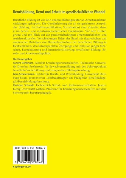 ¿Sandra Bohlinger, Fakultät Erziehungswissenschaften, Technische Universität Dresden, Professorin für Erwachsenenbildung mit den Schwerpunkten berufliche Weiterbildung und komparative Bildungsforschung. Gero Scheiermann, Institut für Berufs- und Weiterbildung, Universität Duisburg-Essen, promovierter Lehrbeauftragter am Fachgebiet Berufspädagogik/Berufsbildungsforschung. Christian Schmidt, Fachbereich Sozial- und Kulturwissenschaften, Justus-Liebig-Universität Gießen, Professor für Erziehungswissenschaften mit dem Schwerpunkt Berufspädagogik.