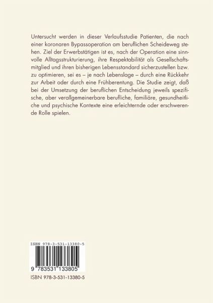 Untersucht werden in dieser Verlaufsstudie Patienten, die nach einer koronaren Bypassoperation am beruflichen Scheideweg stehen. Ziel der Erwerbstätigen ist es, nach der Operation eine sinnvolle Alltagsstrukturierung, ihre Respektabilität als Gesellschaftsmitglied und ihren bisherigen Lebensstandard sicherzustellen bzw. zu optimieren, sei es - je nach Lebenslage - durch eine Rückkehr zur Arbeit oder durch eine Frühberentung. Die Studie zeigt, daß bei der Umsetzung der beruflichen Entscheidung jeweils spezifische, aber verallgemeinerbare berufliche, familiäre, gesundheitliche und psychische Kontexte eine erleichternde oder erschwerende Rolle spielen.
