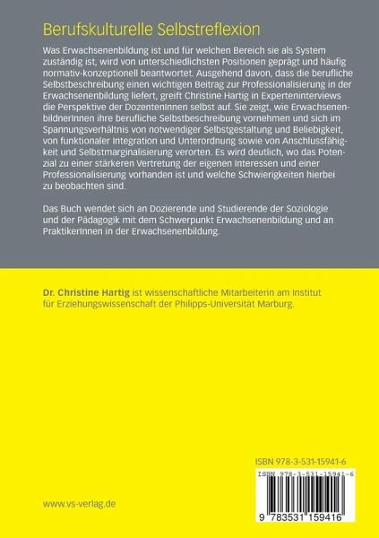 Was Erwachsenenbildung ist und für welchen Bereich sie als System zuständig ist, wird von unterschiedlichsten Positionen geprägt und häufig normativ-konzeptionell beantwortet. Ausgehend davon, dass die berufliche Selbstbeschreibung einen wichtigen Beitrag zur Professionalisierung in der Erwachsenenbildung liefert, greift Christine Hartig in Experteninterviews die Perspektive der DozentenInnen selbst auf. Sie zeigt, wie ErwachsenenbildnerInnen ihre berufliche Selbstbeschreibung vornehmen und sich im Spannungsverhältnis von notwendiger Selbstgestaltung und Beliebigkeit, von funktionaler Integration und Unterordnung sowie von Anschlussfähigkeit und Selbstmarginalisierung verorten. Es wird deutlich, an welchen Stellen das Potenzial zu einer stärkeren Vertretung der eigenen Interessen und einer Professionalisierung vorhanden ist und welche - für die Professionalisierung problematische - Strukturen zu beobachten sind.