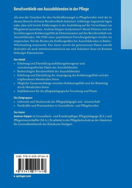 Als eine der Ursachen für den Fachkräftemangel in Pflegeberufen wird der in diesem Bereich oft kurze Berufsverbleib diskutiert. Schlüssige Argumente legen nahe, dass sich bereits Erfahrungen in der Ausbildung auf die Verweildauer im Pflegeberuf auswirken. Andreas Küpper konkretisiert Moral Distress und ein berufsbezogenes Kohärenzgefühl als Determinanten auf den Berufsverbleib von Auszubildenden. Mit Hilfe eines quantitativen Forschungsdesigns werden im empirischen Teil des Buches die Einflussgrößen bei Auszubildenden in Baden-Württemberg untersucht. Der Autor wertet die gewonnenen Daten sowohl deskriptiv als auch interferenzstatistisch aus und diskutiert diese im Kontext bisheriger Erkenntnisse.