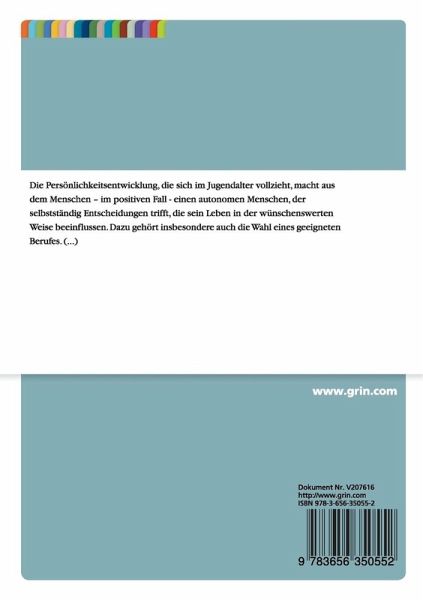 Studienarbeit aus dem Jahr 2012 im Fachbereich Soziologie - Kinder und Jugend, Note: 1,7, Technische Universität Dresden (Soziologie), Veranstaltung: Berufswahl - Freiheit oder Last?, Sprache: Deutsch, Abstract: Die Persönlichkeitsentwicklung, die sich im Jugendalter vollzieht, macht aus dem Menschen - im positiven Fall - einen autonomen Menschen, der selbstständig Entscheidungen trifft, die sein Leben in der wünschenswerten Weise beeinflussen. Dazu gehört insbesondere auch die Wahl eines geeigneten Berufes. Der Übergang von der Schule in das Berufsleben ist durch eine Entwicklung zu erheblich mehr Eigenverantwortung, Selbstdisziplin sowie durch eine Verkürzung der Freizeit gekennzeichnet und beendet so die Kindheit.Die Berufswahl ist deshalb ein wichtiger Bestandteil der Persönlichkeitsentwicklung im Jugendalter.Die folgenden Ausführungen sollen sich deshalb zuerst mit der eher entwicklungspsychologischen Frage beschäftigen, wie Jugendliche eine Identität entwickeln und es zur Herausbildung einer beruflichen Identität kommen kann. Anschließend werden soziologische Konzepte herausgearbeitet und es wird darauf eingegangen, welche Sozialisationsfaktoren die Berufswahl beeinflussen. Des Weiteren sollen auch die Herausforderungen und Schwierigkeiten aufgezeigt werden, welche der Jugendliche im Übergang von der Schule in die Berufswelt zu meistern hat.