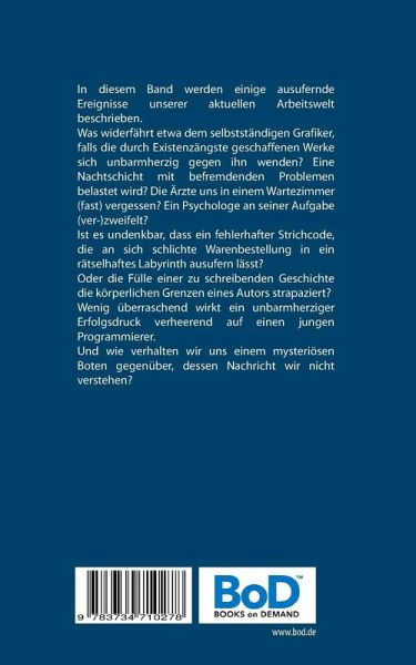 In diesem Band werden einige ausufernde Ereignisse unserer aktuellen Arbeitswelt beschrieben.Was widerfährt etwa dem selbstständigen Grafiker, falls die durch Existenzängste geschaffenen Werke sich unbarmherzig gegen ihn wenden? Eine Nachtschicht mit befremdenden Problemen belastet wird? Die Ärzte uns in einem Wartezimmer (fast) vergessen? Ein Psychologe an seiner Aufgabe (ver-)zweifelt?Ist es undenkbar, dass ein fehlerhafter Strichcode die an sich schlichte Warenbestellung in ein rätselhaftes Labyrinth ausufern lässt? Oder die Fülle einer zu schreibenden Geschichte die körperlichen Grenzen eines Autors strapaziert?Wenig überraschend wirkt ein unbarmherziger Erfolgsdruck verheerend auf einen jungen Programmierer. Und wie verhalten wir uns einem mysteriösen Boten gegenüber, dessen Nachricht wir nicht verstehen?