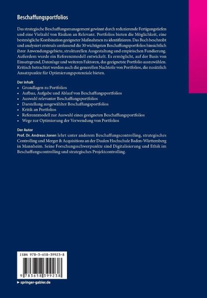 Das strategische Beschaffungsmanagement gewinnt durch reduzierende Fertigungstiefen und eine Vielzahl von Risiken an Relevanz. Portfolios bieten die Möglichkeit, eine bestmögliche Kombination geeigneter Maßnahmen zu identifizieren. Das Buch beschreibt und analysiert erstmals umfassend die 30 wichtigsten Beschaffungsportfolios hinsichtlich ihrer Anwendungsgebiete, strukturellen Ausgestaltung und empirischen Fundierung. Außerdem wurde ein Referenzmodell entwickelt. Es ermöglicht, auf der Basis von Einsatzgrund, Datenlage und weiteren Faktoren, das geeignetste Portfolio auszuwählen. Kritisch betrachtet werden auch die generellen Nachteile von Portfolios, die zusätzlich Ansatzpunkte für Optimierungspotenziale bieten.