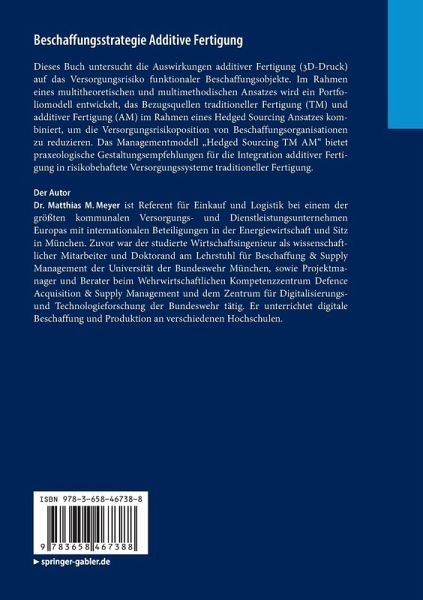 Dieses Buch untersucht die Auswirkungen additiver Fertigung (3D-Druck) auf das Versorgungsrisiko funktionaler Beschaffungsobjekte. Im Rahmen eines multitheoretischen und multimethodischen Ansatzes wird ein Portfoliomodell entwickelt, das Bezugsquellen traditioneller Fertigung (TM) und additiver Fertigung (AM) im Rahmen eines Hedged Sourcing Ansatzes kombiniert, um die Versorgungsrisikoposition von Beschaffungsorganisationen zu reduzieren. Das Managementmodell "Hedged Sourcing TM AM" bietet praxeologische Gestaltungsempfehlungen für die Integration additiver Fertigung in risikobehaftete Versorgungssysteme traditioneller Fertigung.