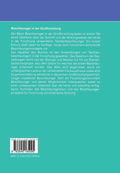 Einführung.- Zur Technik der Beschleuniger.- Allgemeine Prinzipien.- Teilchenstrahlen der Beschleuniger.- Strahlführung und Fokussierung.- Teilchenbeschleunigung.- Vakuum.- Kontrollen.- Die wichtigsten Beschleunigertypen.- Linearbeschleuniger.- Der Kreisbeschleuniger.- Konzepte künftiger Beschleuniger für ultra-hohe Energien.- Beschleuniger und ihre Anwendungen.- Teilchenbeschleuniger in Biologie und Medizin.- Beschleuniger in Material- und Festkörperforschung.- Beschleuniger in der Fusionsforschung.- Beschleuniger in der Kernphysik.- Beschleuniger in Hochenergie und Elementarteilchenphysik.- Lexikon der Fachausdrücke.- Liste der Beschleuniger in der Großforschung mit Kenndaten.