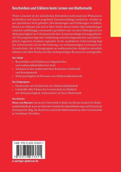 Wenn Lernende in der mündlichen Interaktion mathematische Phänomene beobachten und davon ausgehend Zusammenhänge entdecken, werden sie aus sprachlicher Sicht gefordert, Beschreibungen und Erklärungen zu äußern. Mona-Lisa Maisano hat sich in ihrer Studie diesen beiden Sprechhandlungen zunächst unabhängig voneinander gewidmet und vor dem Hintergrund der Mehrsprachigkeit im Schulunterricht ihre Zusammenhänge herausgearbeitet. Als Theoriegerüst liegt eine Verbindung zwischen linguistischen und philosophisch-logischen Ansätzen zugrunde. In der qualitativen Untersuchung liegt der Schwerpunkt auf der Betrachtung von mehrsprachigen Lernenden der Grundschule, die in Kleingruppen an mathematischen Aufgaben mündlich arbeiten und dabei flexibel auf ihre mehrsprachigen Ressourcen zurückgreifen.