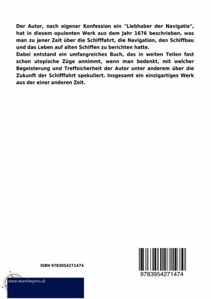 Der Autor, nach eigener Konfession ein "Liebhaber der Navigatie", hat in diesem opulenten Werk aus dem Jahr 1676 beschrieben, was man zu jener Zeit über die Schifffahrt, die Navigation, den Schiffbau und das Leben auf alten Schiffen zu berichten hatte.Dabei entstand ein umfangreiches Buch, das in weiten Teilen fast schon utopische Züge annimmt, wenn man bedenkt, mit welcher Begeisterung und Treffsicherheit der Autor unter anderem über die Zukunft der Schifffahrt spekuliert. Insgesamt ein einzigartiges Werk aus der einer anderen Zeit.