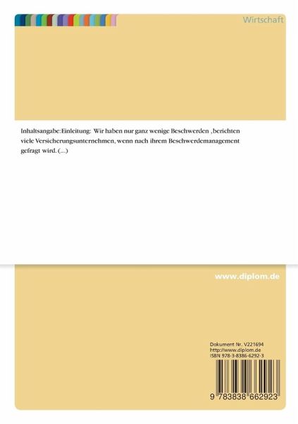 Projektarbeit aus dem Jahr 2002 im Fachbereich BWL - Investition und Finanzierung, Note: 1,7, IHK zu Coburg (Betriebswirtschatslehre), Sprache: Deutsch, Abstract: Inhaltsangabe:Einleitung: Wir haben nur ganz wenige Beschwerden , berichten viele Versicherungsunternehmen, wenn nach ihrem Beschwerdemanagement gefragt wird. Doch kann daraus zwangsläufig eine hohe Kundenzufriedenheit mit den angebotenen Produkten oder Leistungen abgeleitet werden? Enthalten nicht gerade Beschwerden konkrete Hinweise, die auf die Leistungsqualität schließen lassen? Dabei stellen die intensive Auseinandersetzung mit dem Kunden und eine hohe Kundenzufriedenheit wesentliche Voraussetzungen für eine langfristige Kundenbindung dar.