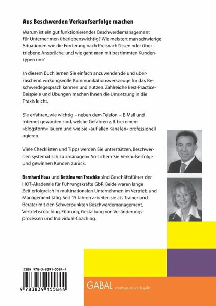 Warum ist ein gut funktionierendes Beschwerdemanagement für Unternehmen überlebenswichtig? Wie meistert man schwierige Situationen wie die Forderung nach Preisnachlässen oder übertriebene Ansprüche, und wie geht man mit bestimmtem Kundentypen um?In diesem Buch lernen Sie einfach anzuwendende und überraschend wirkungsvolle Kommunikationswerkzeuge für das Beschwerdemanagement kennen und nutzen. Zahlreiche Best-Practice-Beispiele und Übungen machen Ihnen die Umsetzung in die Praxis leicht. Sie erfahren wie wichtig - neben dem Telefon - E-Mail und Internet geworden sind, welchen Gefahren z.B. bei einem Blogstorm lauern und wie Sie auf allen Kanälen professionell agieren- Viele Checklisten und Tipps werden Sie unterstützen, Beschwerden systematisch zu "managen". So sichern Sie die Verkaufserfolge und gewinnen Kunden zurück.Bernhard Haas und Bettina von Troschke sind Geschäftsführer der HOT-Akademie für Führungskräfte GbR. Beide waren lange Zeit erfolgreich in der multinationalen Unternehmen im Vertrieb und Management tätig. Seit 15 Jahren arbeiten Sie als Trainer und Berater mit den Schwerpunkten Beschwerdemanagement, Vertriebscoaching, Führung, Gestaltung von Veränderungsprozessen und Individual-Coaching.