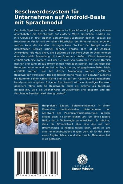 Durch die Speicherung der Beschwerde im Sprachformat (mp3, wav) können Analphabeten die Beschwerde auf einfache Weise einreichen, sodass sie ihre Gefühle in ihrer eigenen Sprechweise ausdrücken können, sodass die Beschwerde klar ist und von einem Mitarbeiter des Unternehmens angehört werden kann, der sie dann eintragen kann. So kann der Mangel in dem betreffenden Bereich schnell behoben werden. Dies ist die Android-Anwendung, die dazu dient, die Bedürfnisse der Menschen im Unternehmen über die mobile Anwendung mit ihrer Stimme zu äußern. Diese Anwendung enthält auch eine Kamera, mit der sie Fotos von Problemen in ihrem Bereich machen und dann an das Unternehmen hochladen können. Der Standort des Benutzers kann anhand der bei der Registrierung eingegebenen Daten leicht ermittelt werden. Nur bei dieser Anwendung werden gefälschte Beschwerden vermieden. Bei der Registrierung muss der Benutzer zunächst die Nummer seiner Aadhar-Karte und die auf der Aadhar-Karte angegebene Handynummerangeben. Bei jeder Beschwerde wird ein einmaliges Passwort generiert. Wenn sich die Beschwerde mehr als zweimal als Fälschung herausstellt, wird die Aadhar-Karte zurückverfolgt und gesperrt und der fälschende Benutzer wird streng bestraft.